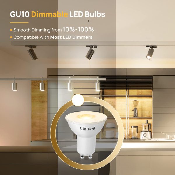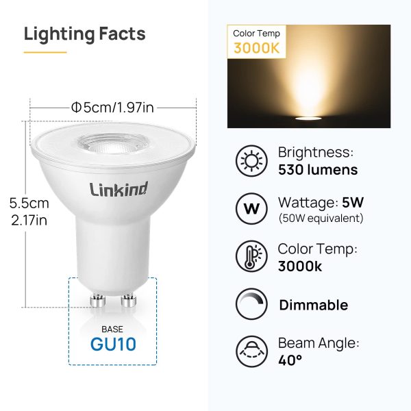 - 【Super Bright GU10 Bulbs】 Linkind GU10 LED dimmable light bulbs provide 530 lumens light output, much brighter than others. They offer 3000K warm and comfortable lighting with high CRI80+, makes color appears more vivid and looks natural. UL Listed.